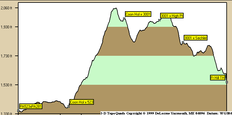 The bad news for cyclists is that we can't find a way to make this detour without hills. The roads identified as more suitable for bicycles have less traffic and gentler gradients than the options identified as more suitable for cars. Even those are steep, as shown by the profile view at the bottom of the page. From Confluence to Ft Hill, there is no way to avoid climbing -- Confluence is at elevation 1320', Harnedsville is at 1400', and you must climb at least once to 2000' (north of the intersection of SR3001 and High Point Rd) before descending to the Ft Hill trailhead at 1540'. Although the route from Ft Hill to Confluence is largely downhill, there's a 220' climb on Sechler Rd, another 220' climb just south of Ft Hill Church, and a couple of smaller hills.